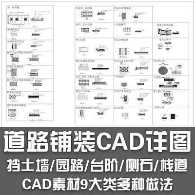 道路铺装CAD详图/挡土墙坡道路缘侧石园林地面铺装做法CAD施工图热门设计联盟服务商